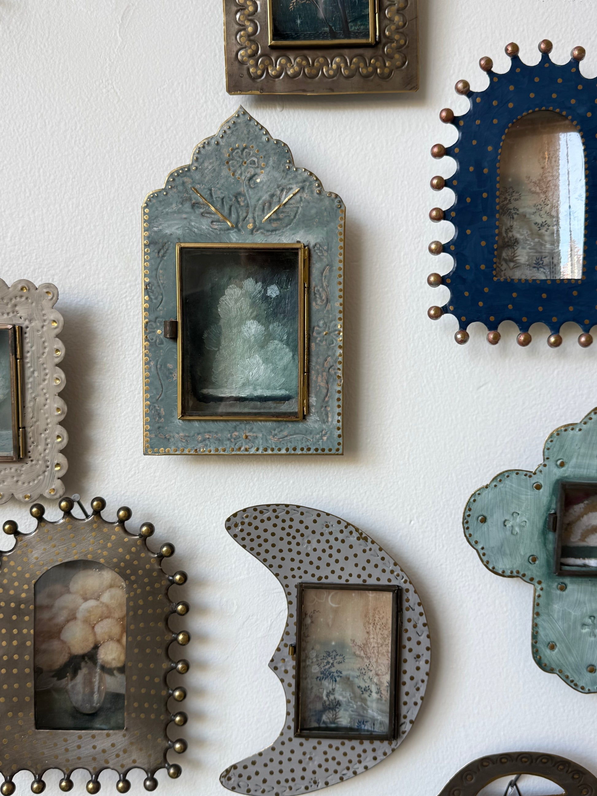 Measuring 8" x 5" x 1". This treasure is made up of a small oil painting depicting billowing clouds over a horizon, a moody moment in time. Housed in a hand cut/hand stamped Mexican tin frame. The frame is painted in muted blue gray and embellished with metallic gold dots. Shipping is complimentary within the USA.