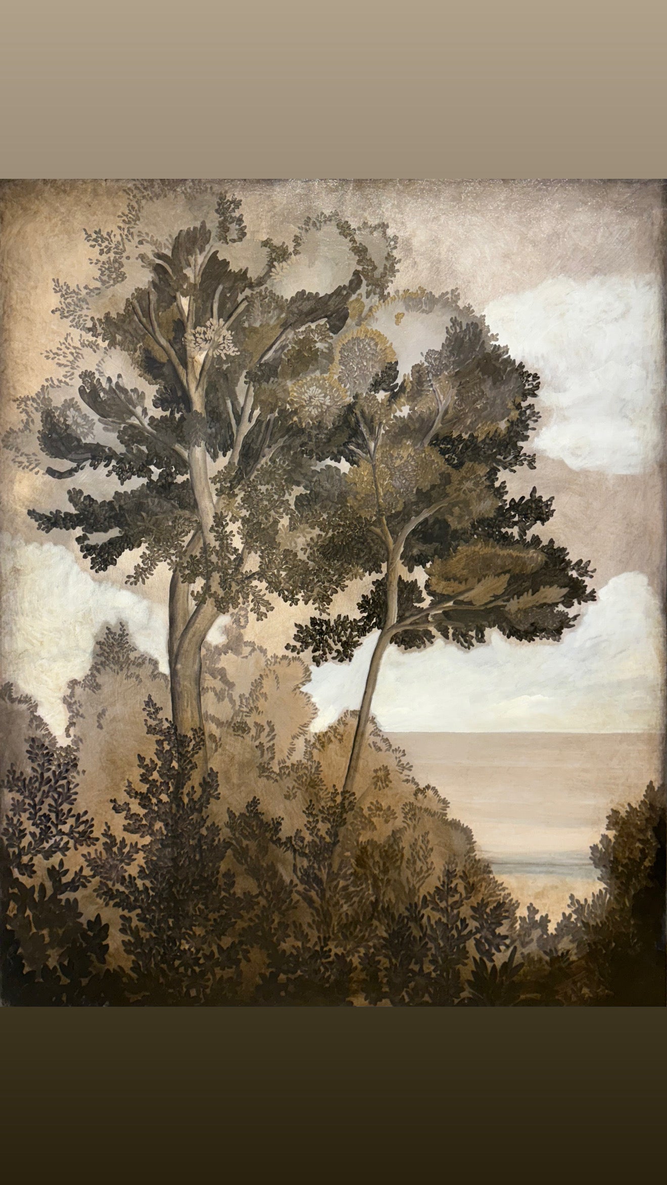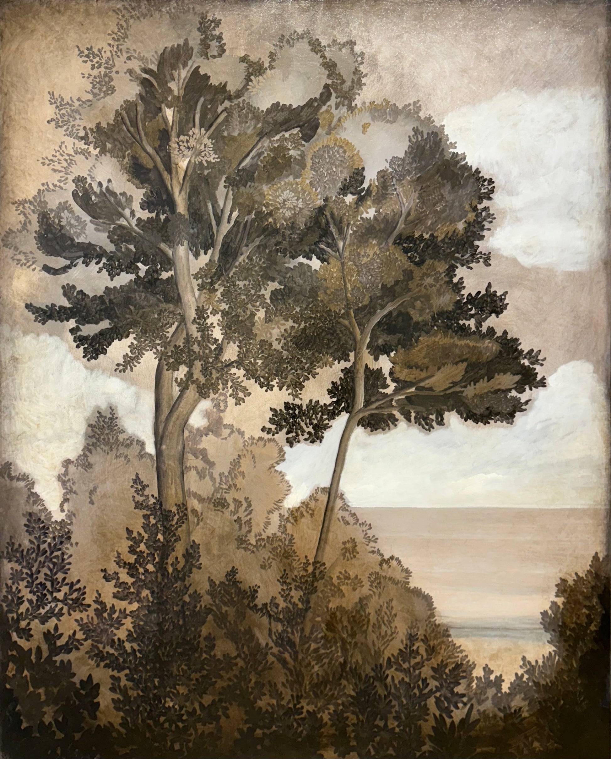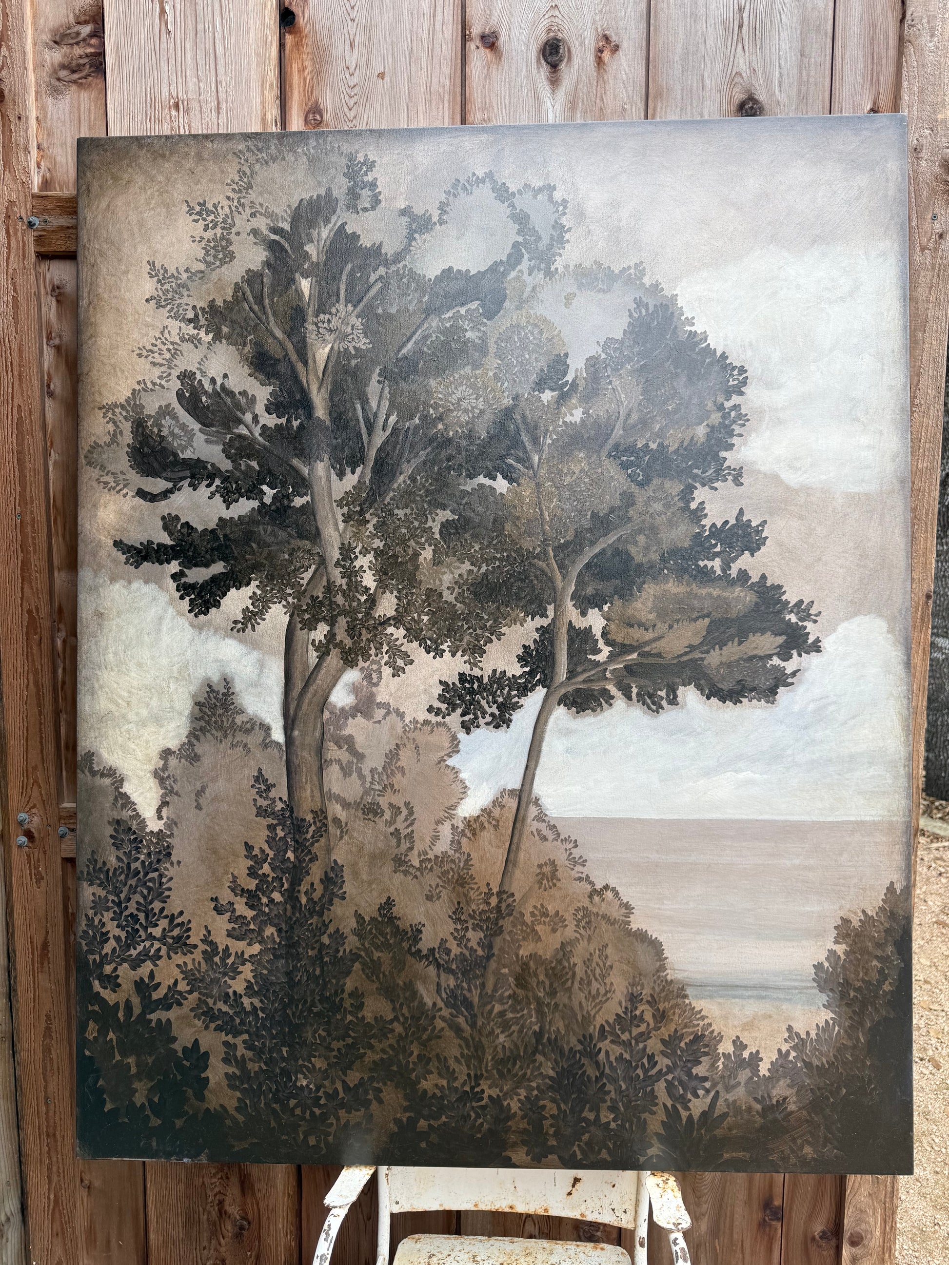 "Brave" depicts two trees, stylized and a bit abstract, lush and alive, securely grounded and overlooking the distant sea. Painted in warm muted browns and creams. Shipping is held separately. Reach out to Colette@ColetteCosentino.com for information on shipping.