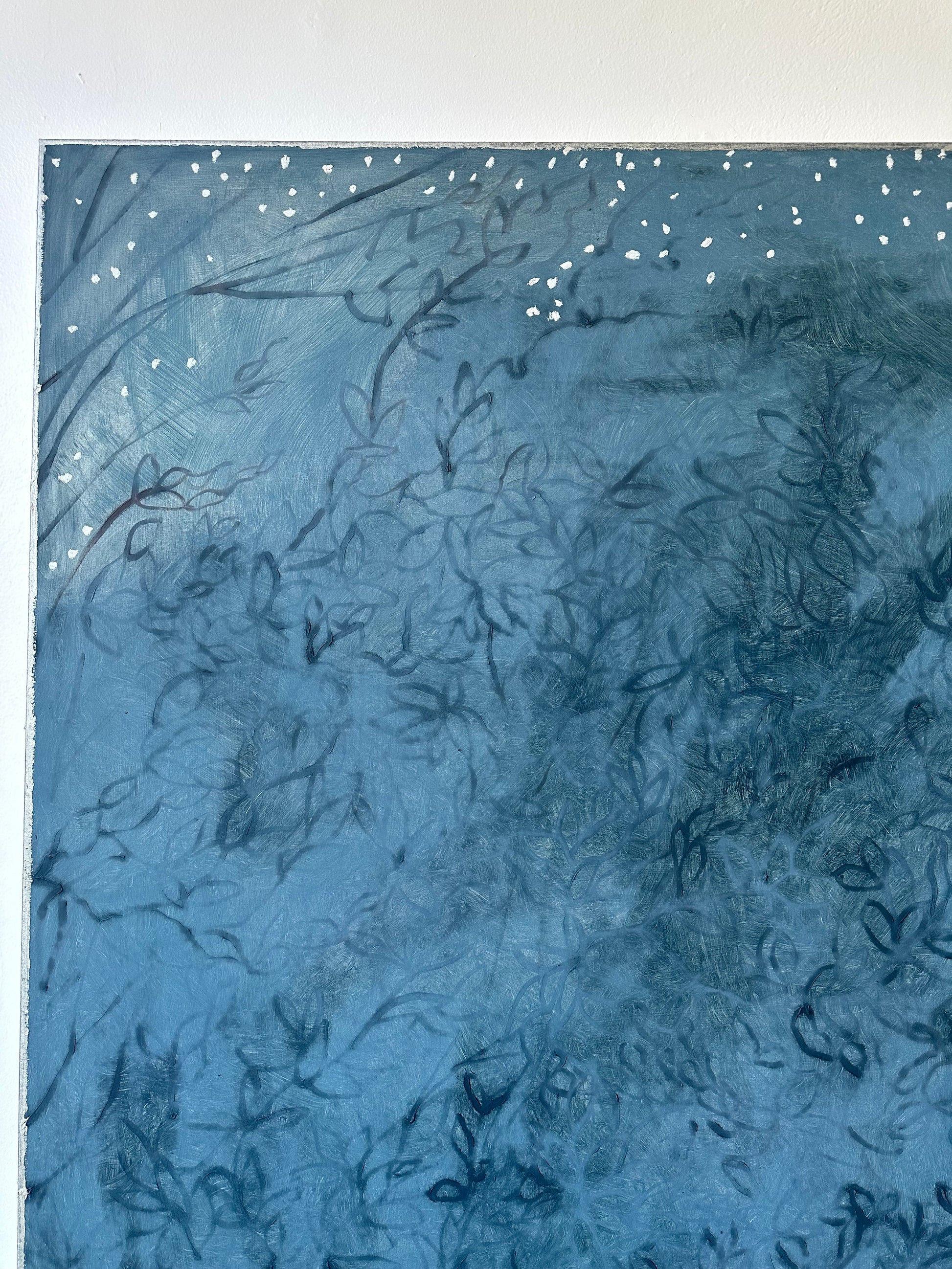 "C'est Bon!" A subtle and rich monochromatic painting of abstract-ish leaf work in a rich but dusty blue with white dots representing stars at the top and the words "C'est Bon" handwritten along the bottom. Painted in oil on canvas, this is a fresh contemporary piece that would be a welcome addition to any wall.