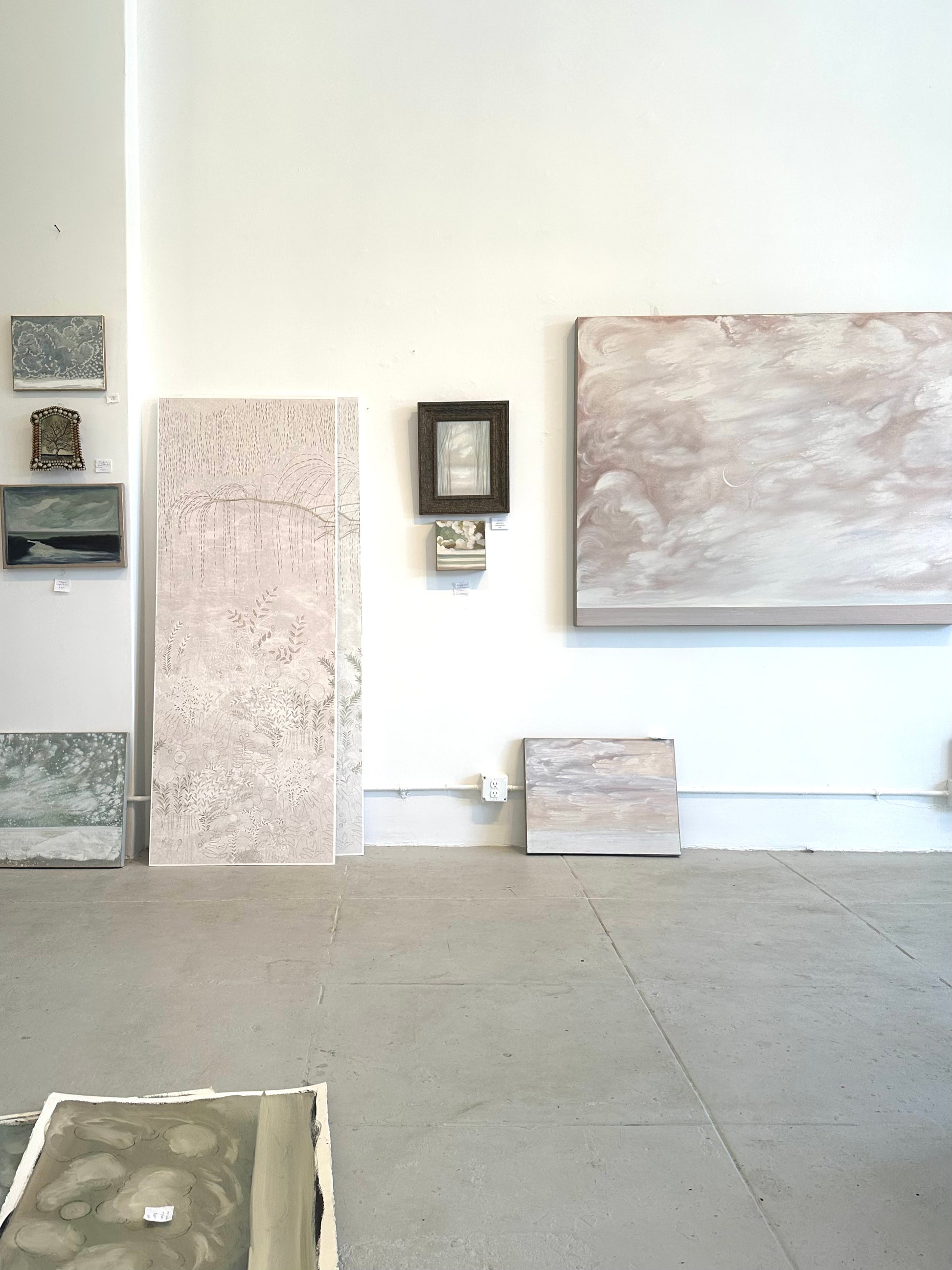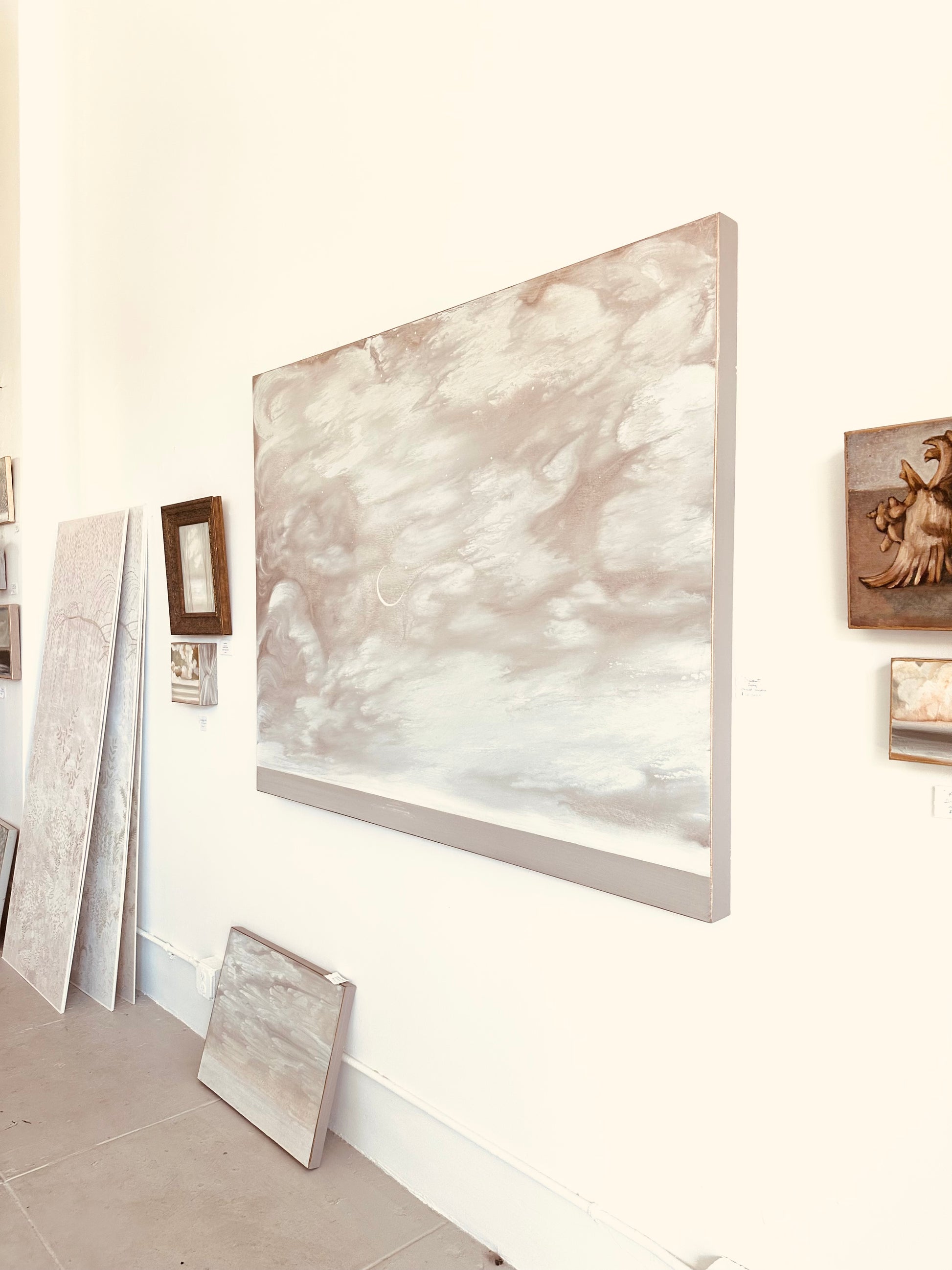 "Crescent in Pink" depicts a slight crescent moon taking the stage in a happily pink cotton candy evening sky. Twinkling stars peak through. An iridescent glaze dazzles the surface of the canvas, so depending on where you stand, the tones change from gray to pink. Painted on deep 3" edge canvas. Shipping is held separately. Contact Colette@ColetteCosentino.com for details.