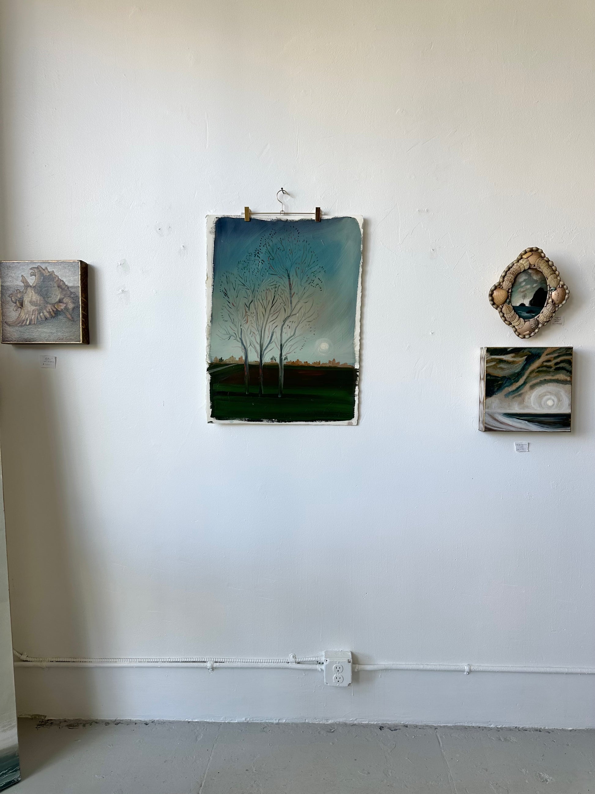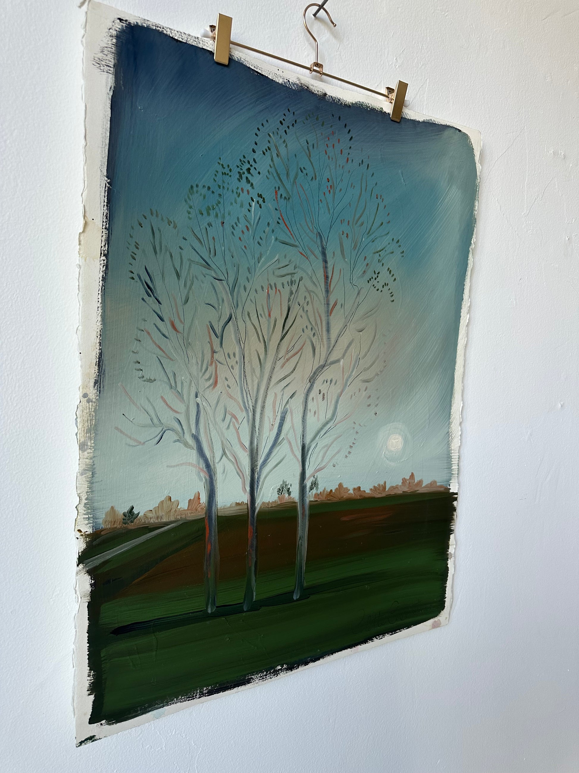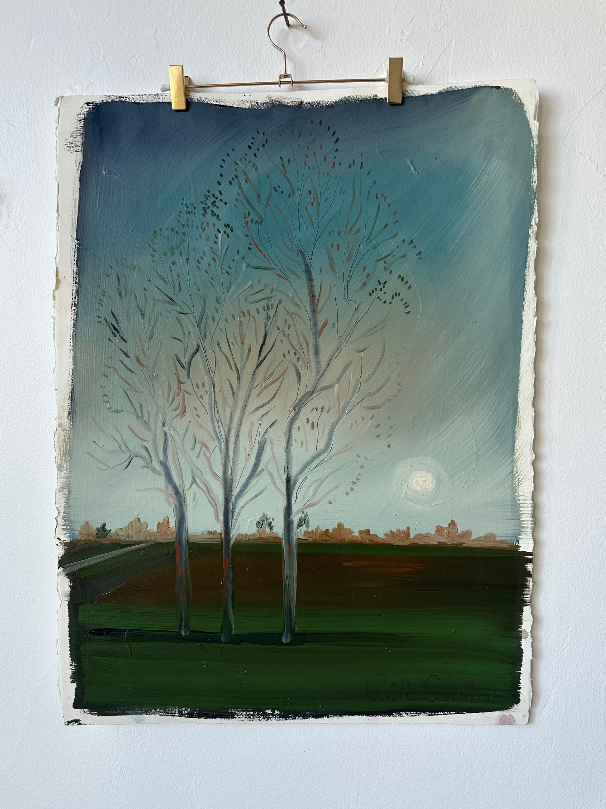 "Eastern Line" landscape oil painting on watercolor paper of trees with moon rising