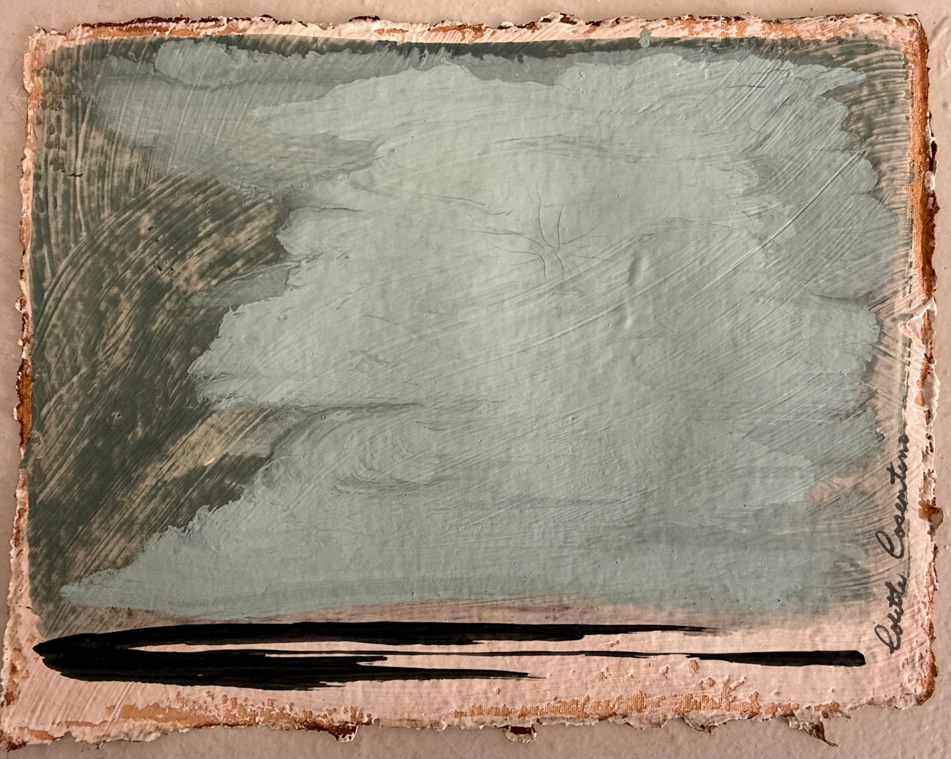 "Emerging" is a rather abstract depiction of a landscape. A tree moves into frame from the left, a low, black horizon line implies a calm sea and shore. Painted in muted tones, mostly pale blue, on handmade heavy watercolor paper with a rough deckled edge. Shipping is complimentary within the USA.