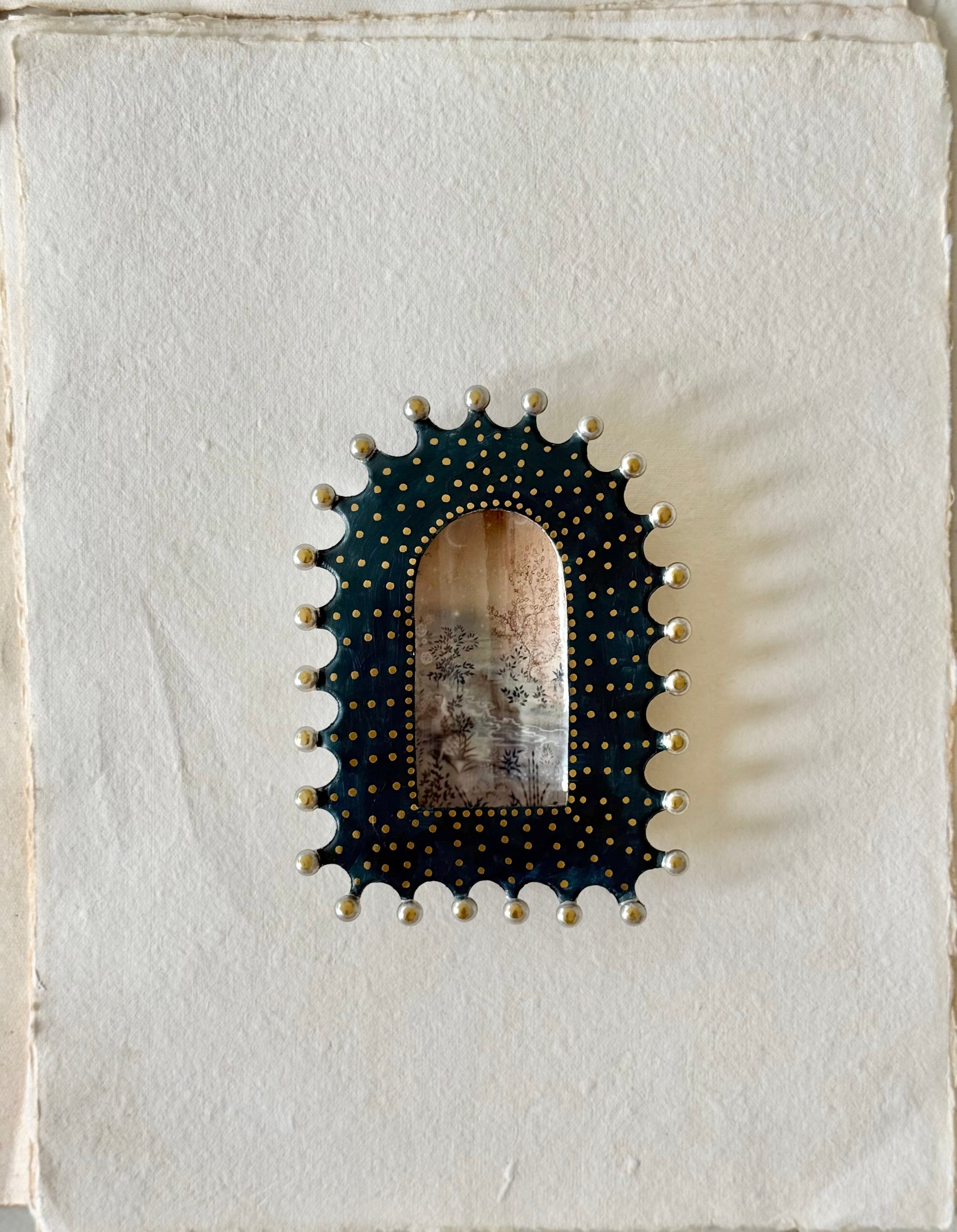 Measuring 7 1/2" x 5 1/2" x 1" This treasure is made up of a small glossy print of my "Encanto" image. It's beautifully housed in a hand cut, hand crafted Mexican tin frame. I've painted it in a rich navy blue and hand embellished it with metallic gold dots. Shipping is complimentary within the USA.