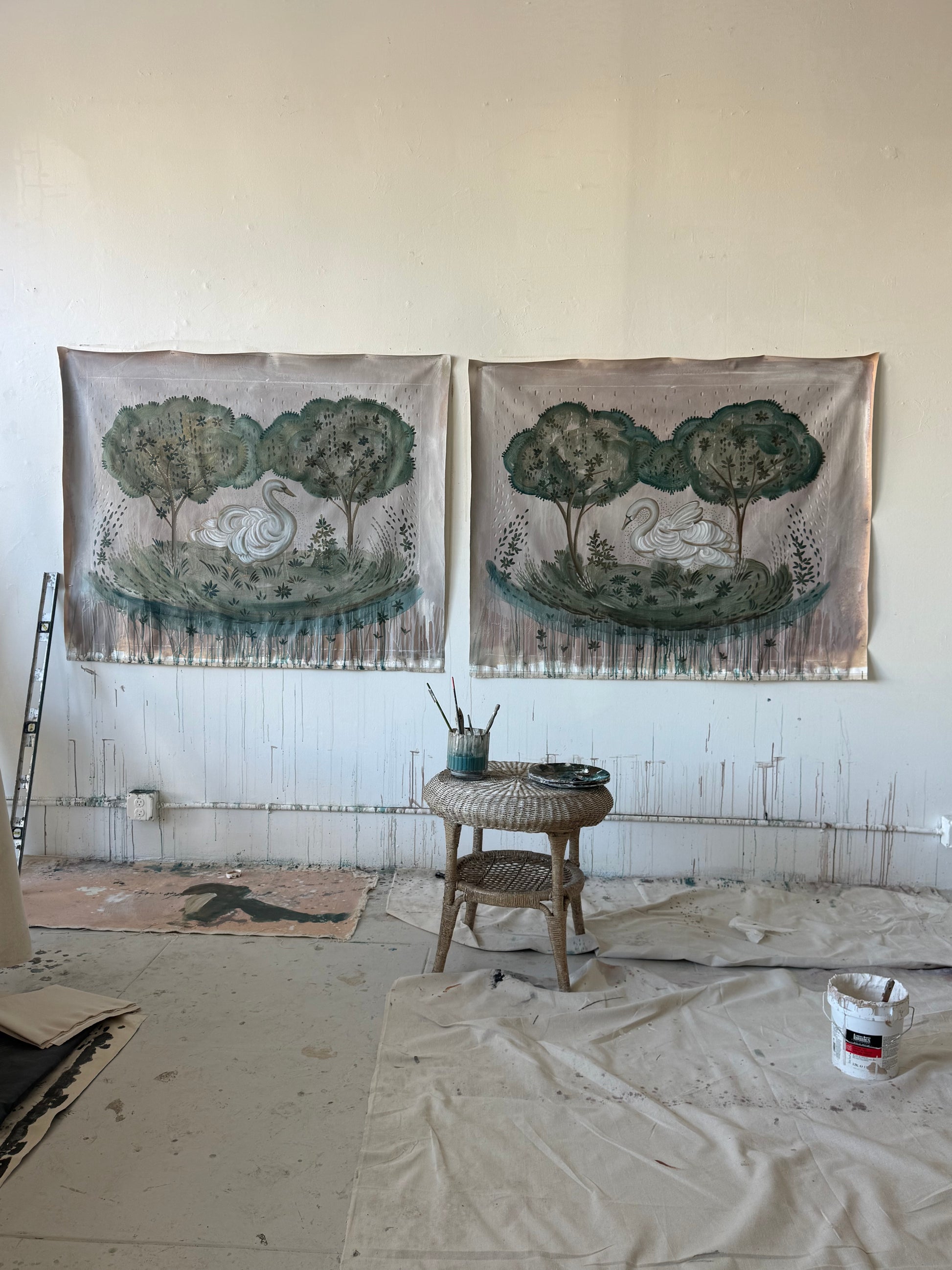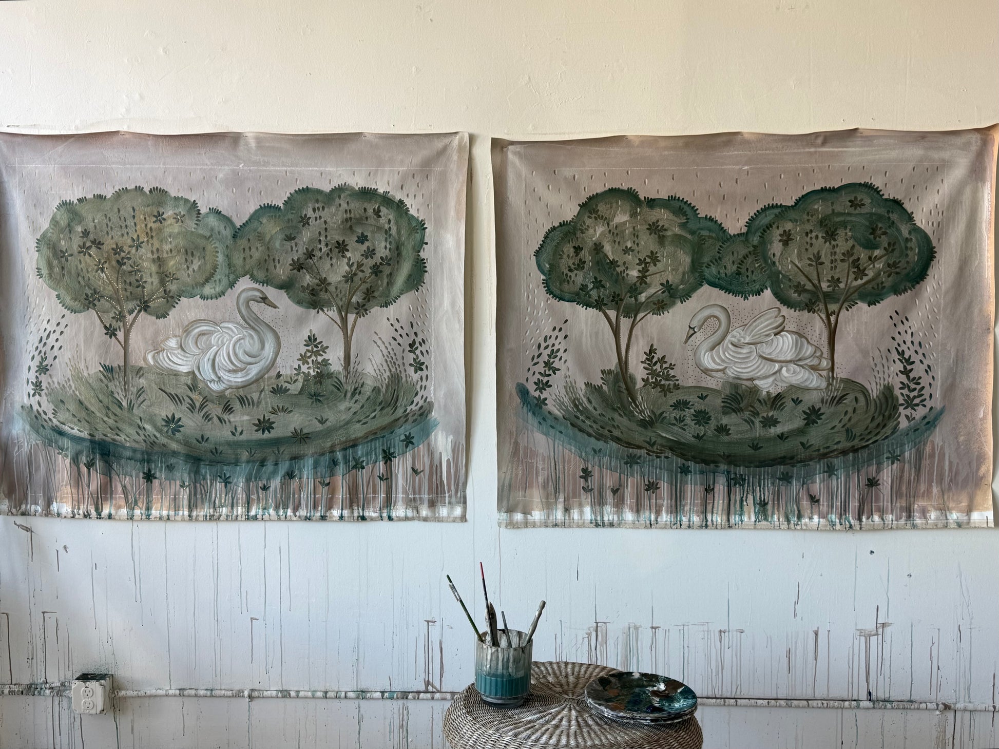 40" x 50" painted on loose canvas, with extra canvas around the edges for stretching. Swans take center stage as each searches for butterflies in their own private garden. Colette's signature loose painted drips and metallic gold dot work. In tones of beige, pale lavender and pink, greens and shades of white. Once stretched the paintings will be tricked out with metallic gold piping. Ready by April 7. $5,800 each