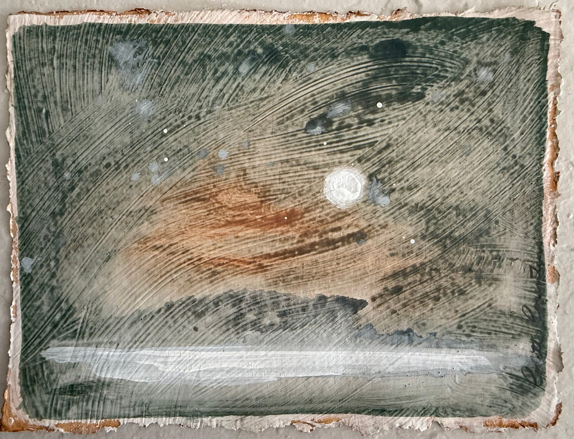 "Forever Is Upon Us" 9" x 12" flat acrylic on handmade heavy watercolor paper with a rough deckled edge. Ethereal, dreamy, this moody work depicts a warm glowing sky, bright moon cracking, and white calm seas. Shipping is complimentary within the USA.