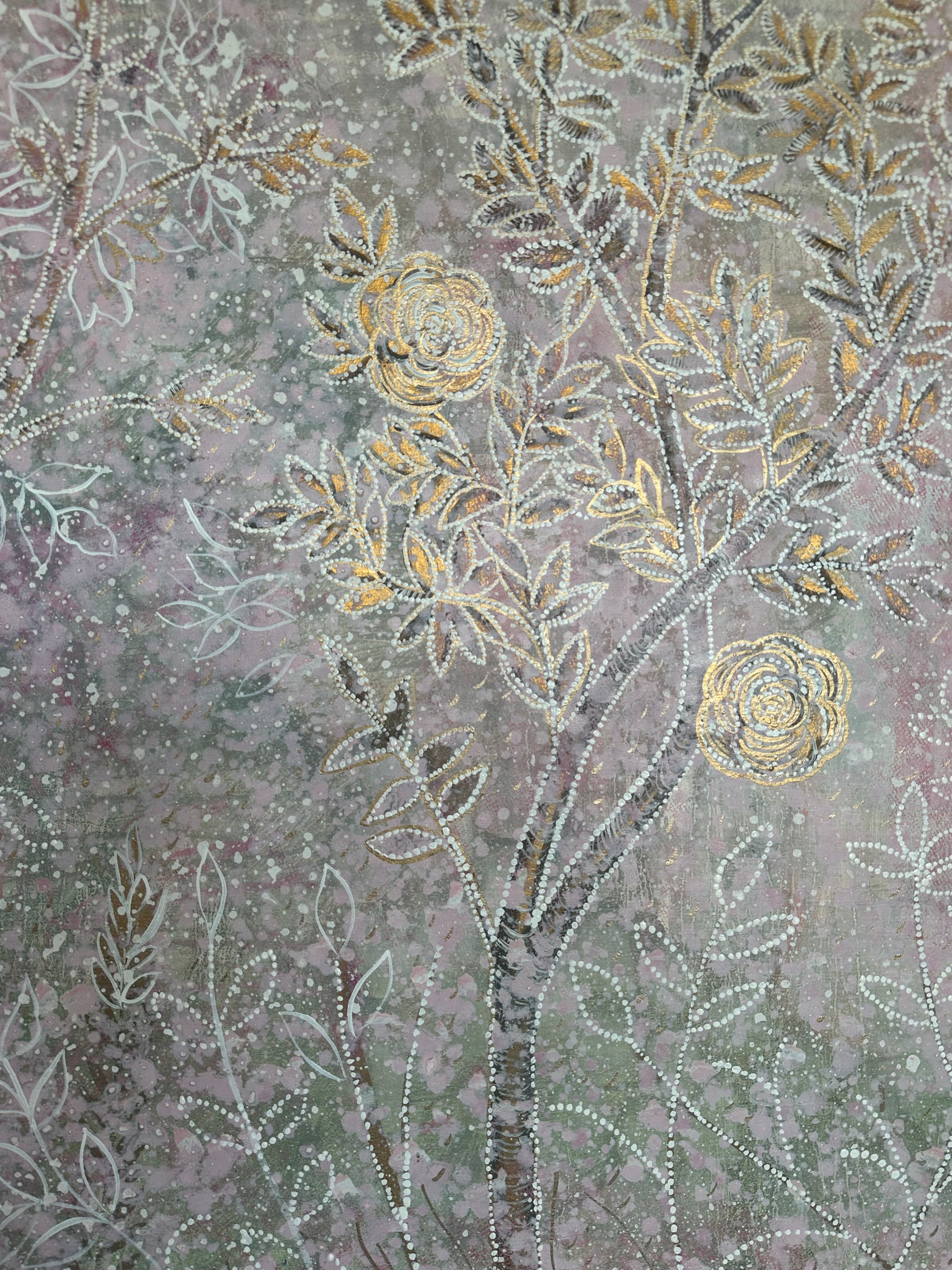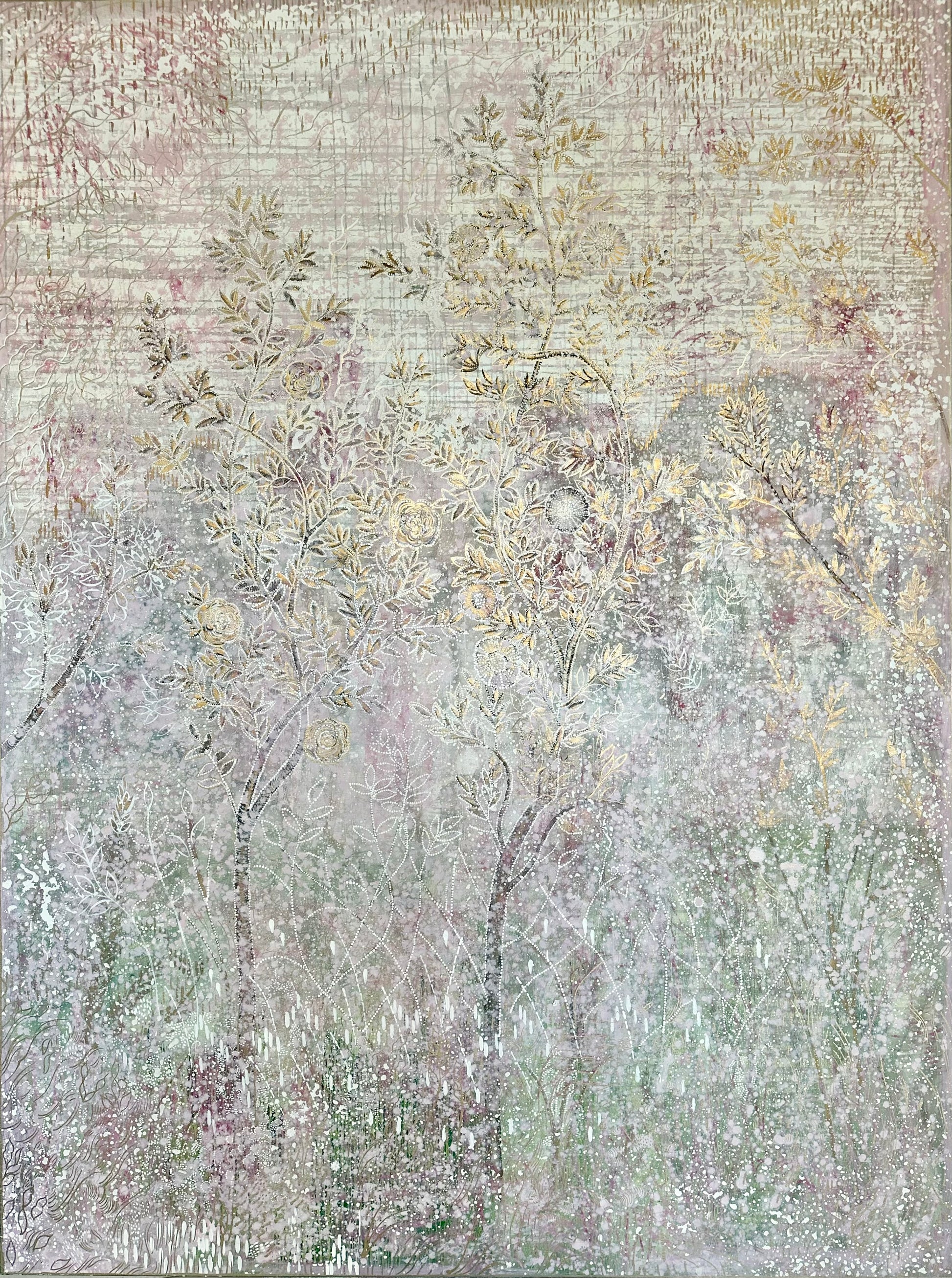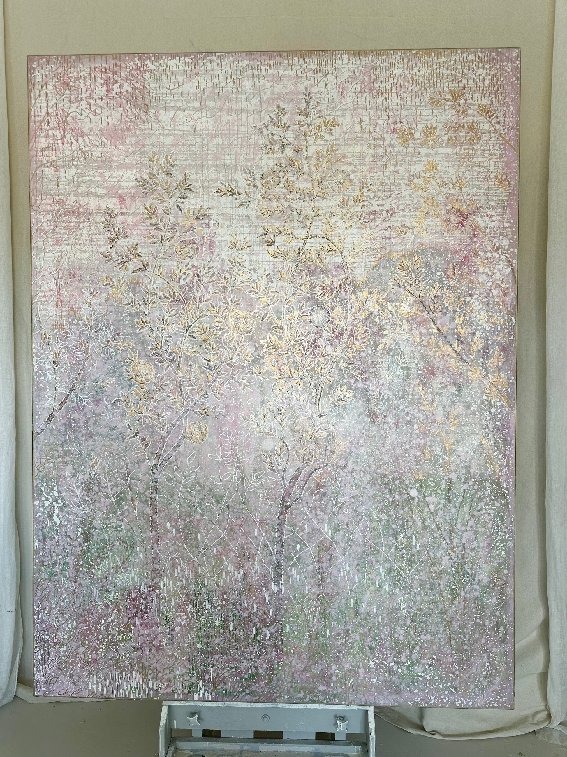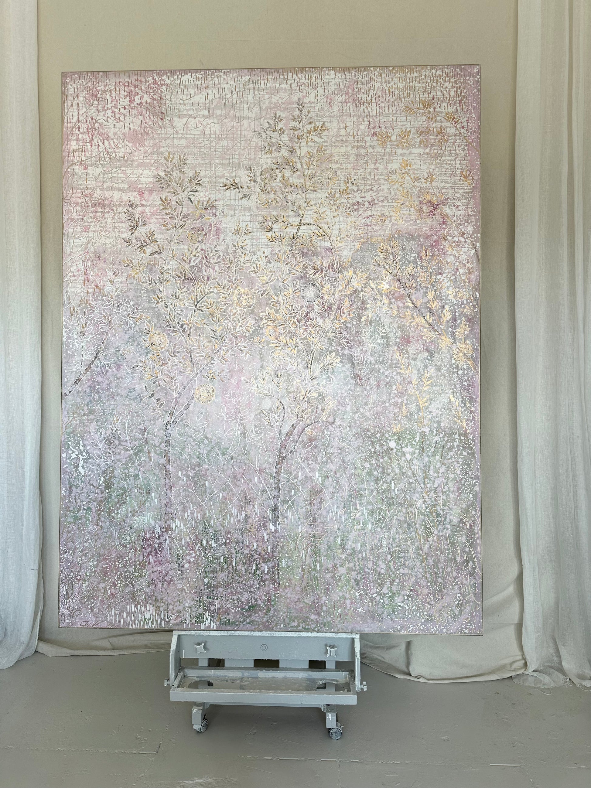 "Francine's Garden" depicts decoratively adorned chinoiserie-esque trees in a garden vignette. It's overall tone in person is a cool pink that occasionally verges on lavender but not quite. Pale greens merge through the many layers towards the bottom half of the work. Fanciful and happy, a bit abstract, with haphazard lines scrawled upon the sky, depicting that something is in the air. Standing 8 ft tall and 6 ft wide with 2 3/4" sides. Shipping is held separately. contact Colette@ColetteCosentino.com for details on your destination.
