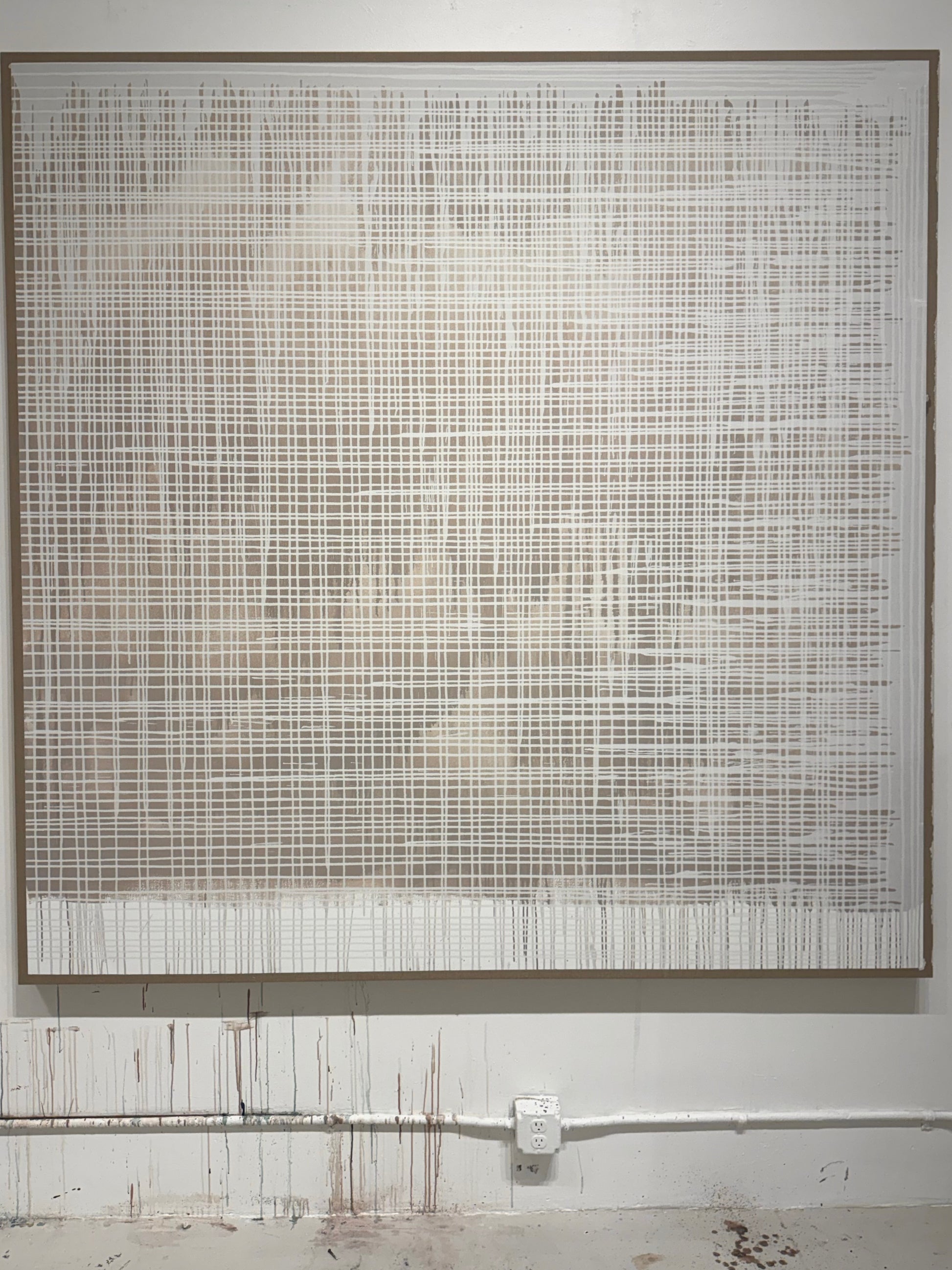 "Frequency" 84" x 84" abstract in beige and white on Belgian linen