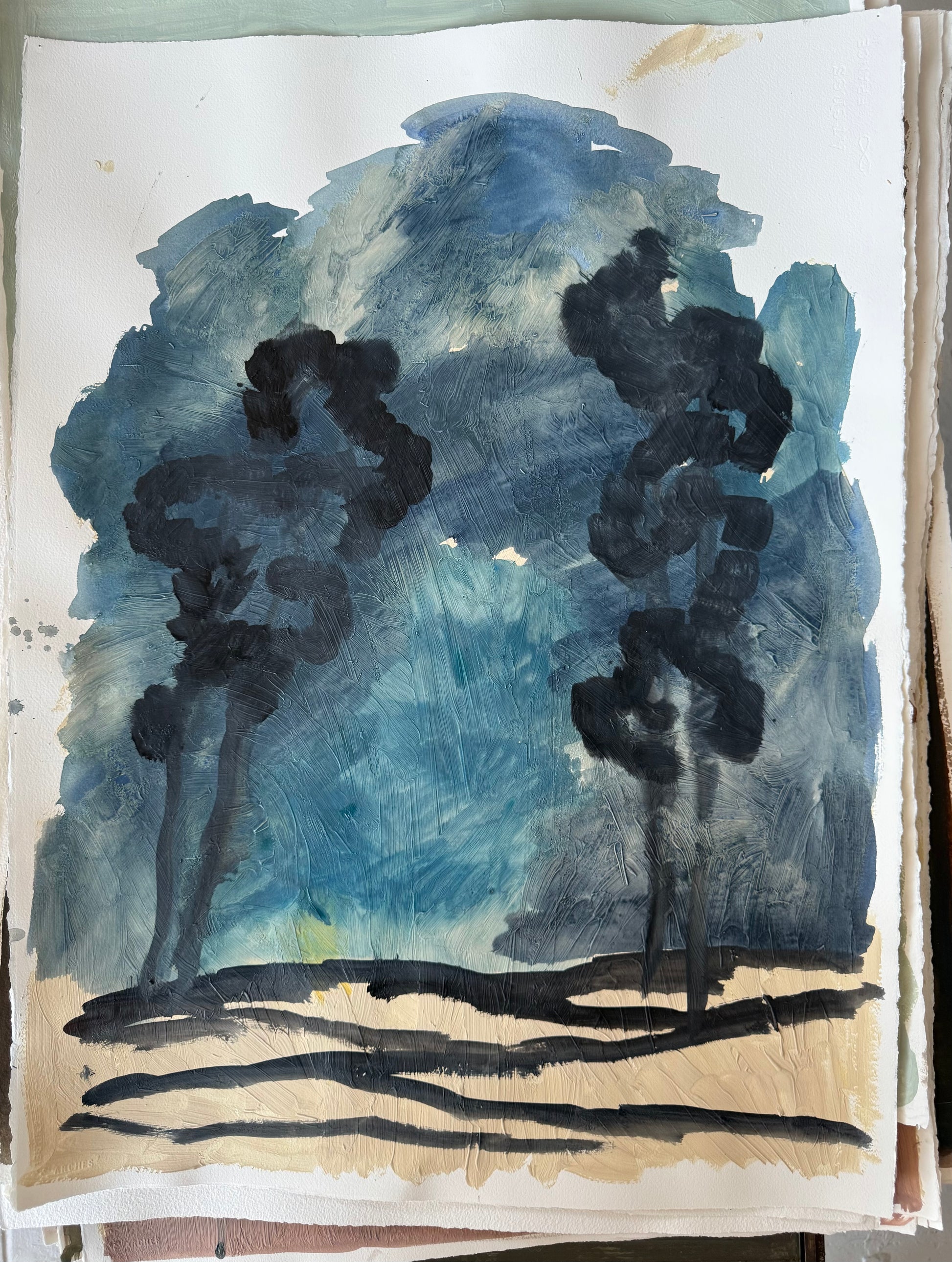 An abstract landscape with a rich blue sky, trees and foreground.Painted in oil on heavy Arches watercolor paper.