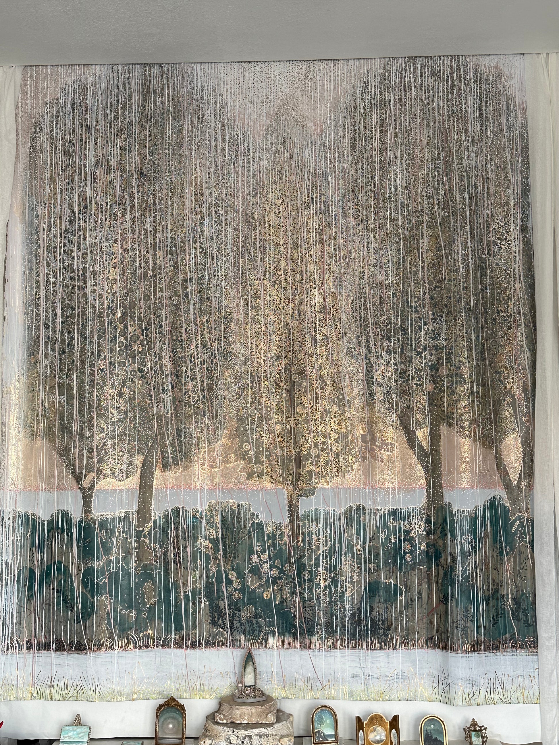 "Paradiso" is a large scale work on loose heavy weight canvas. 11 ft tall x 9 1/2 ft wide. The center tree, gilded beyond gilded, stands with her friends to the right and to the left. A calm horizon line anchors the background. Whimsical foliage gilded and playful hold down the foreground. Floral and Maximalist, a "rain" of drips from top to bottom adds a contemporary abstract edge, covering the whole work in a play of "risk". Rich greens, shades of pinks and peach, beige, gray, white. Best seen in person for the incredible amount of detail and dot work. I painted this piece over the course of a few years, starting in late February 2020. Needless to say it became one of my covid projects, and I found it very cathartic to create. The delicacy of the flowered trees and foliage is in contrast to the lumbering, somewhat horsey trunks of the trees..... areas where perhaps growth must take place. Life is, after all, a work in progress. X Colette Shipping is held separately. Contact Colette@ColetteCosentino.com for details for your destination.
