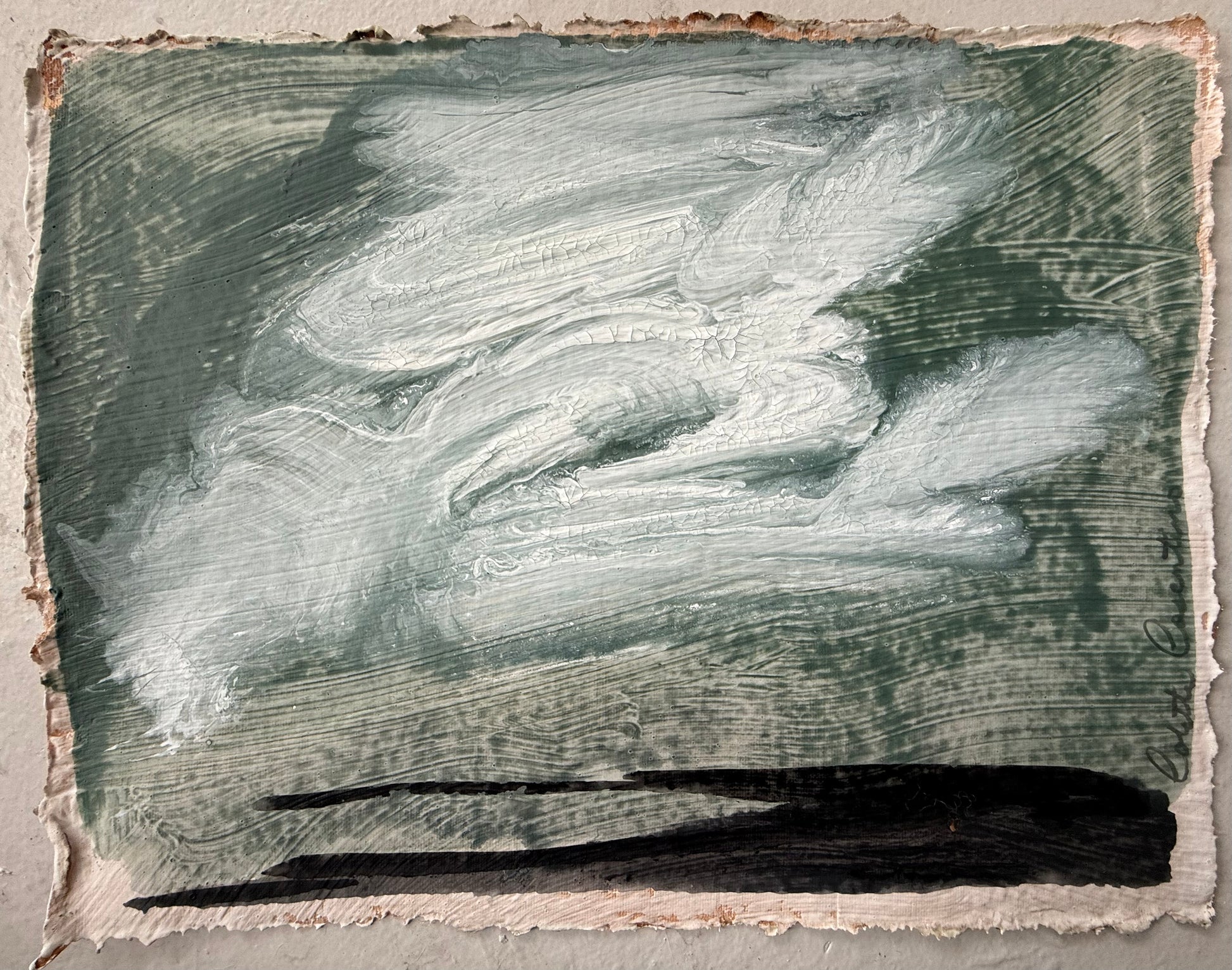 "Message" depicts a horizon in silhouette, a moody sky above. Swift and swirling clouds tell a story of what is passed or what is to come. Painted in muted tones of blue green, black and white. Both representational and abstract in manor. Complimentary shipping within the USA.