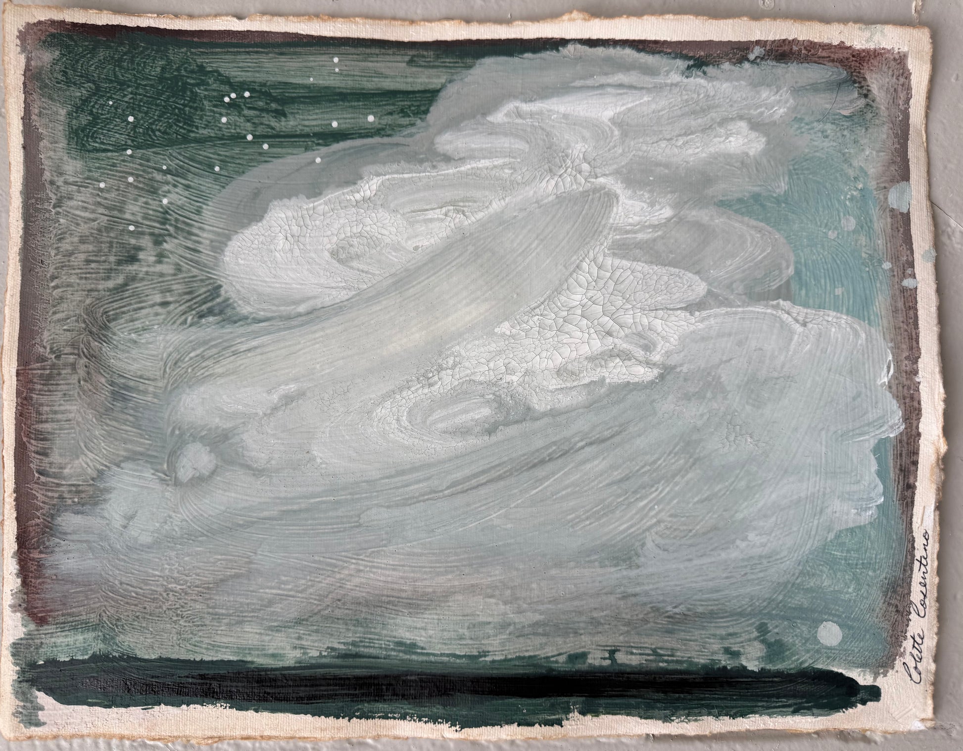 "Monumental" 11" x 14" is painted on handmade paper with a rough deckled edge. This moving ethereal work depicts a billowing cloud, moving swiftly upwards. Tinkling stars illuminate the night sky, as the dark and low horizon line maintains a even calm. Shipping is complimentary within the USA.