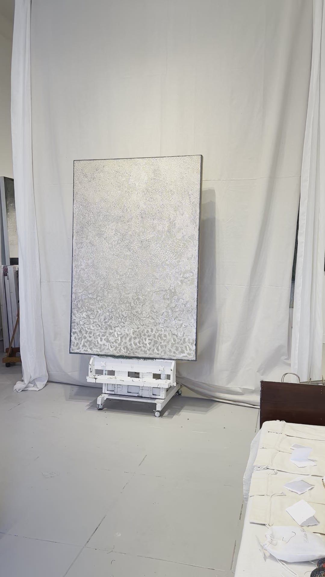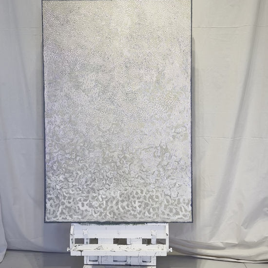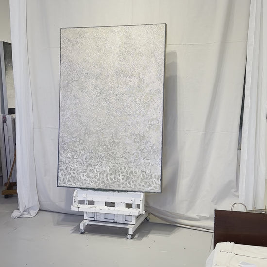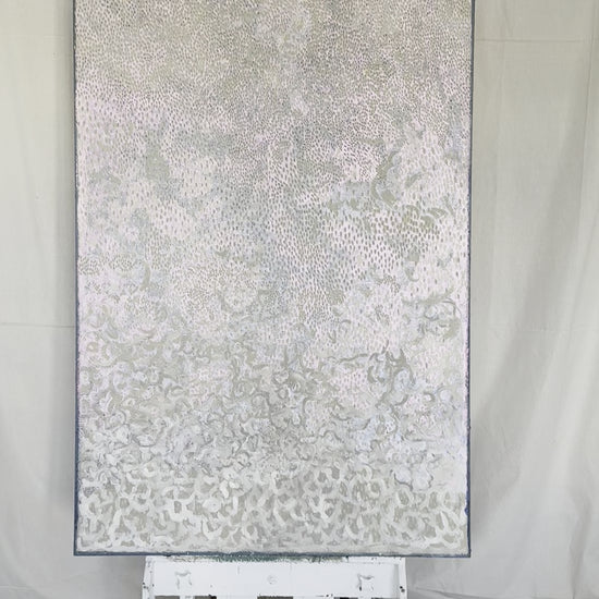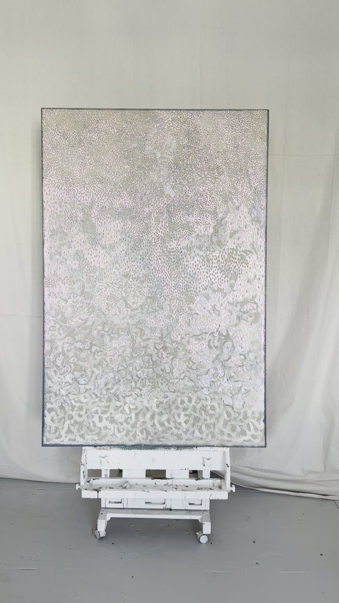 "Pearl" 72" x 48" an abstract painting layered in oil on deep edge canvas. The irredescent effect of this piece creates a real experience for the viewer. It changes with whatever light is cast upon it. Most magnificent with direct natural light. Most pale with overhead interior light. Moves and changes as you pass by. The feeling conveyed is one of bliss, joy, contentment. Shipping is held separately. Contact Colette@ColetteCosentino.com for shipping details.