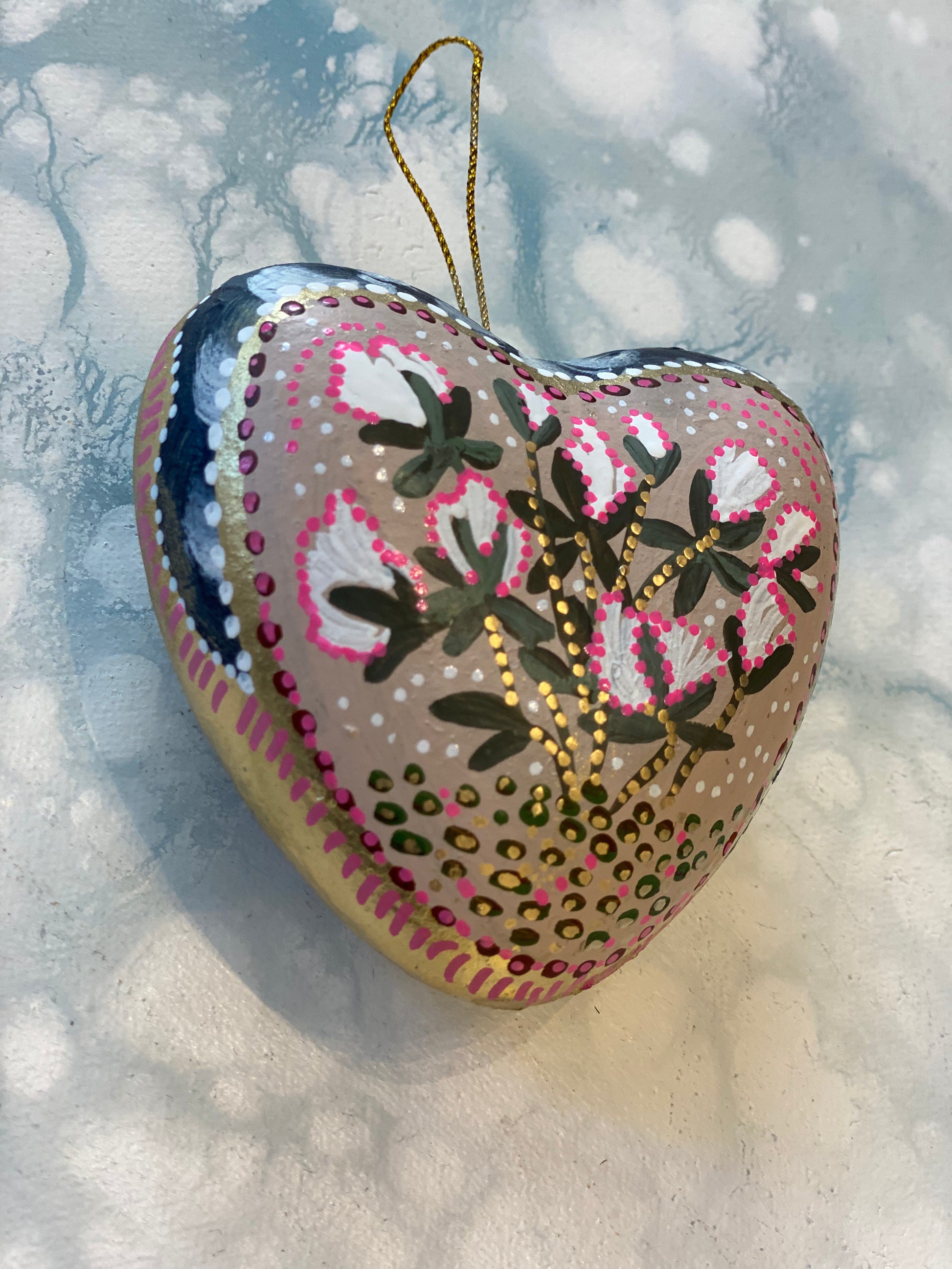A floral of florals, these pink and white poppies have been painted painstakingly with love. Made of papier mache, and comes in a cotton draw string pouch. Signed and dated 2022 on the back. A work of art, to be treasured for years to come.