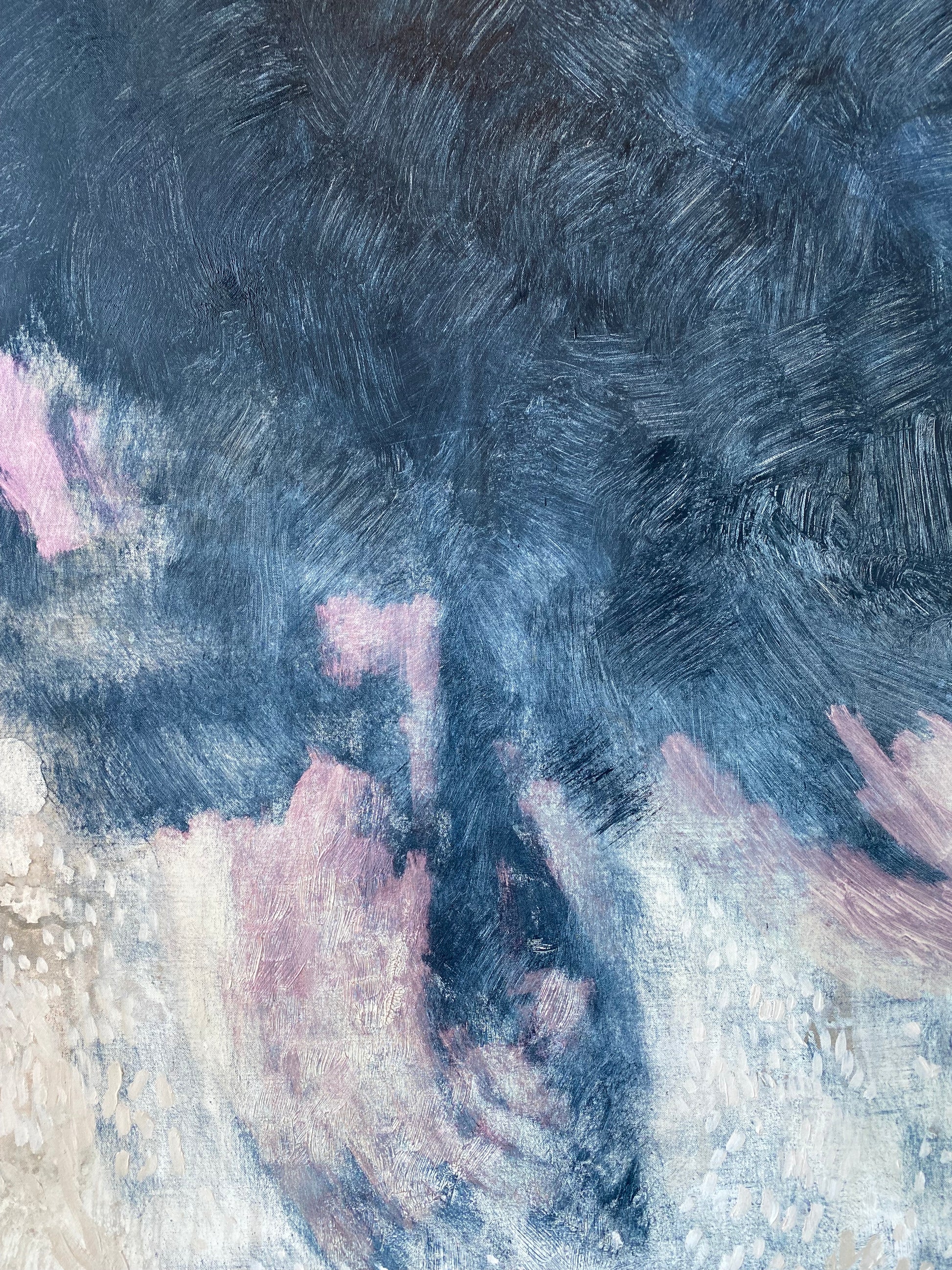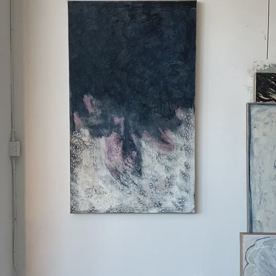 "Rock & Roll" 60" x 30" oil on canvas. Inky blue paint strokes etch their way through this abstract painting. Interference red was used, and really illumines that work as you pass by. An adventurous piece, confident, rich.