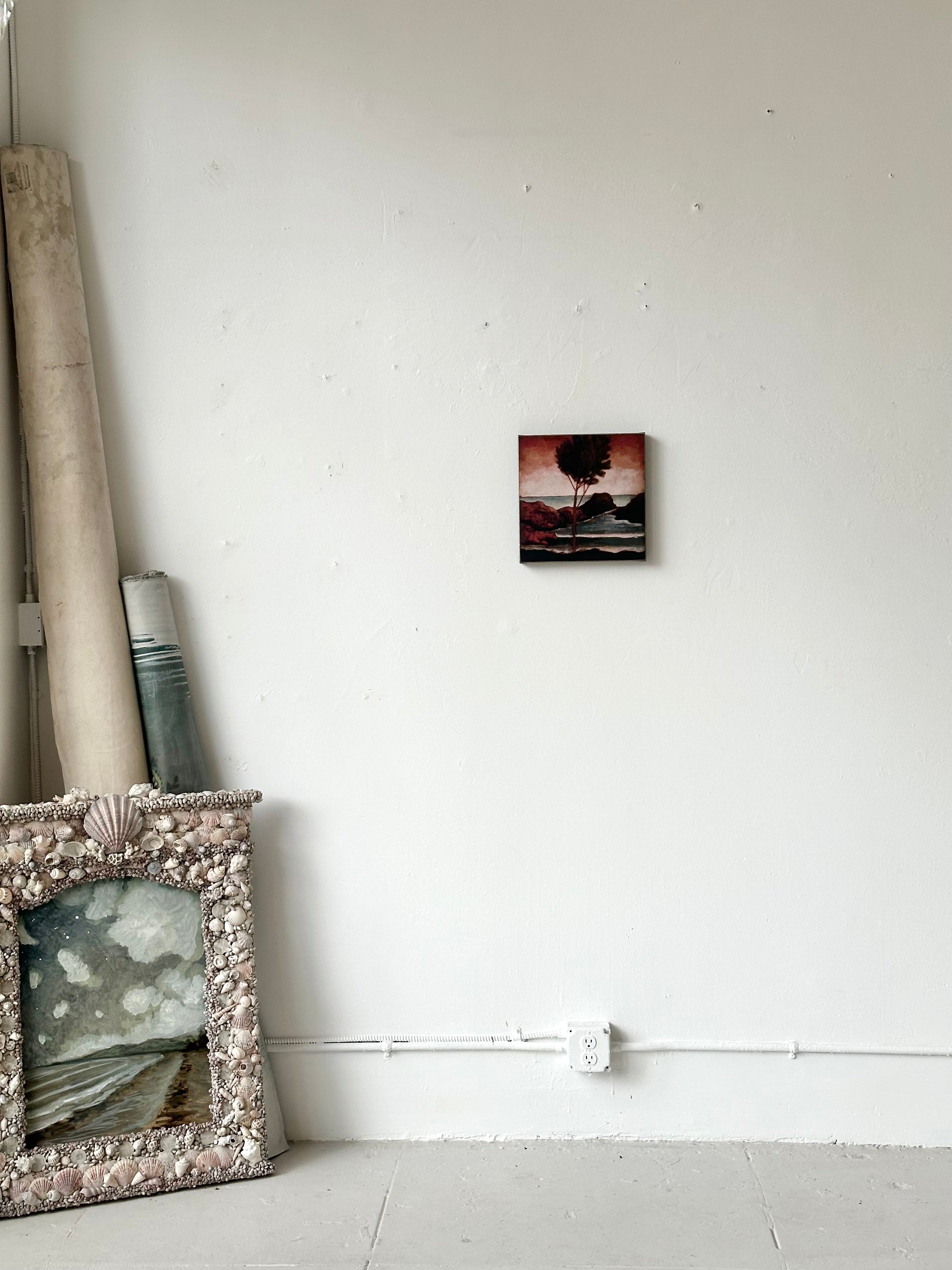 "Sonic Sunset" depicts a glowing red orange sky, the mist rising from the ancient sea. Rocks are all aglow with the radiant light. It's a calm day at sea, the waves lap in tenderly. 12" x 12"x 1" deep.