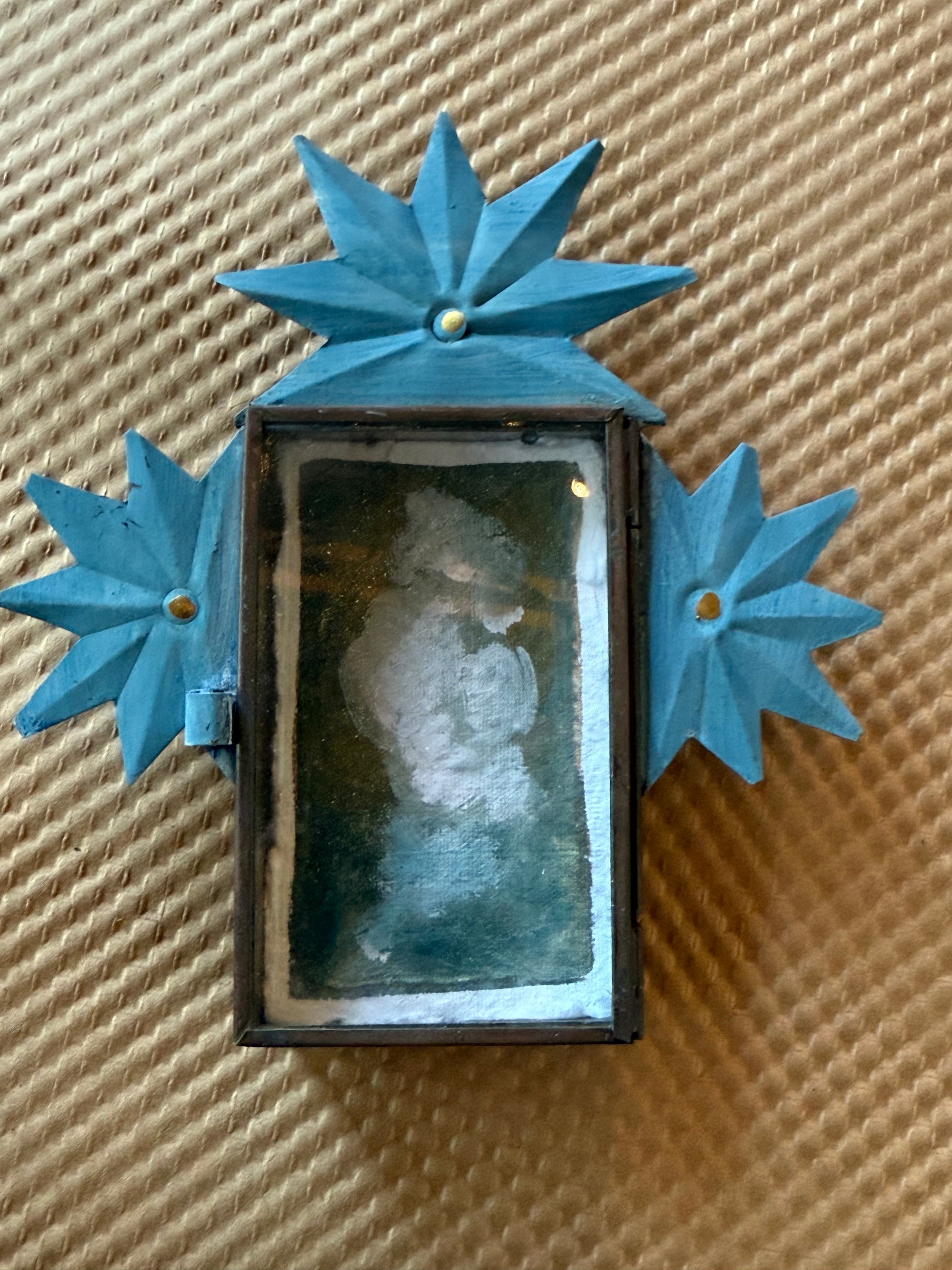 Oil painting of clouds on handmade paper within a hand painted Mexican tin.
