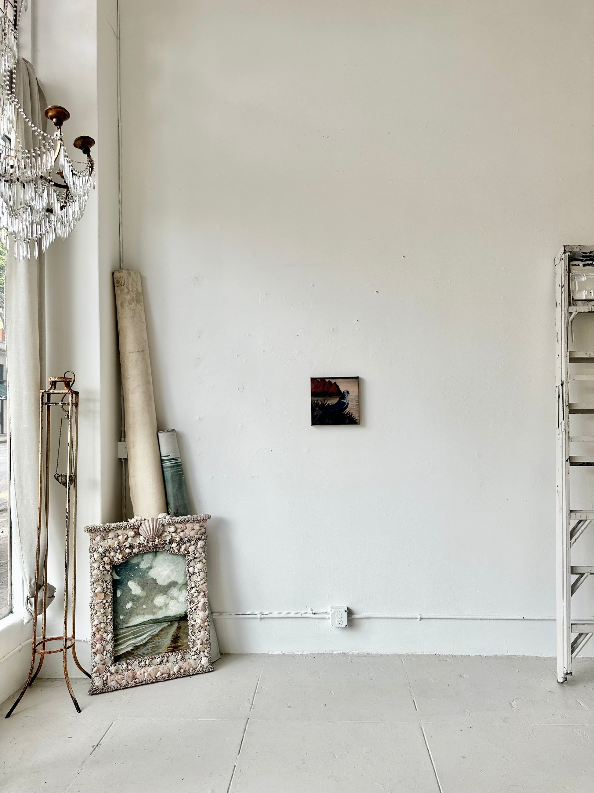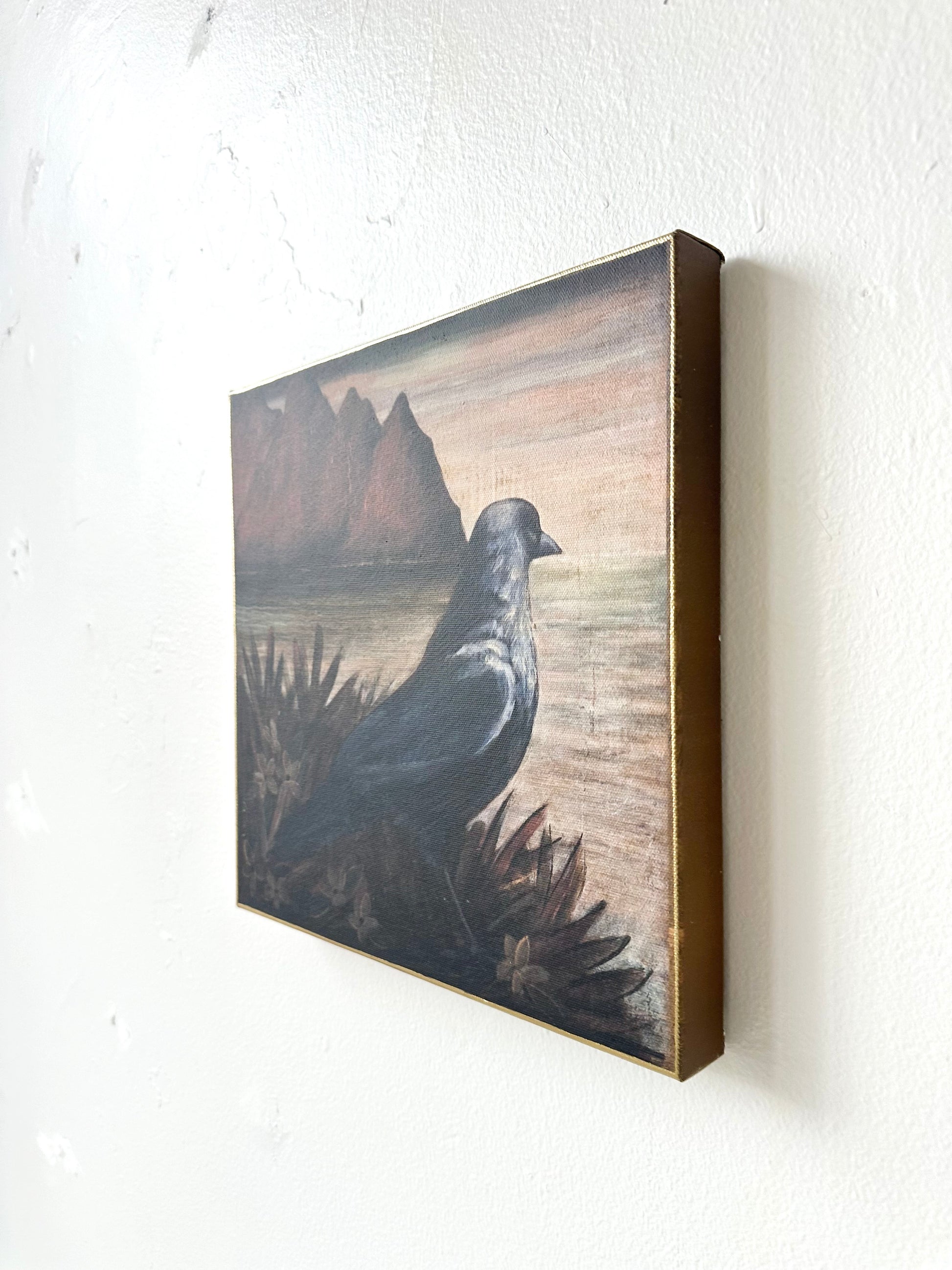 "Watchful" depicts a resting blackbird looking out at the horizon line of the sea. Strange and beautiful mountainous rocks jet out from the abyss. Moody and soulful.